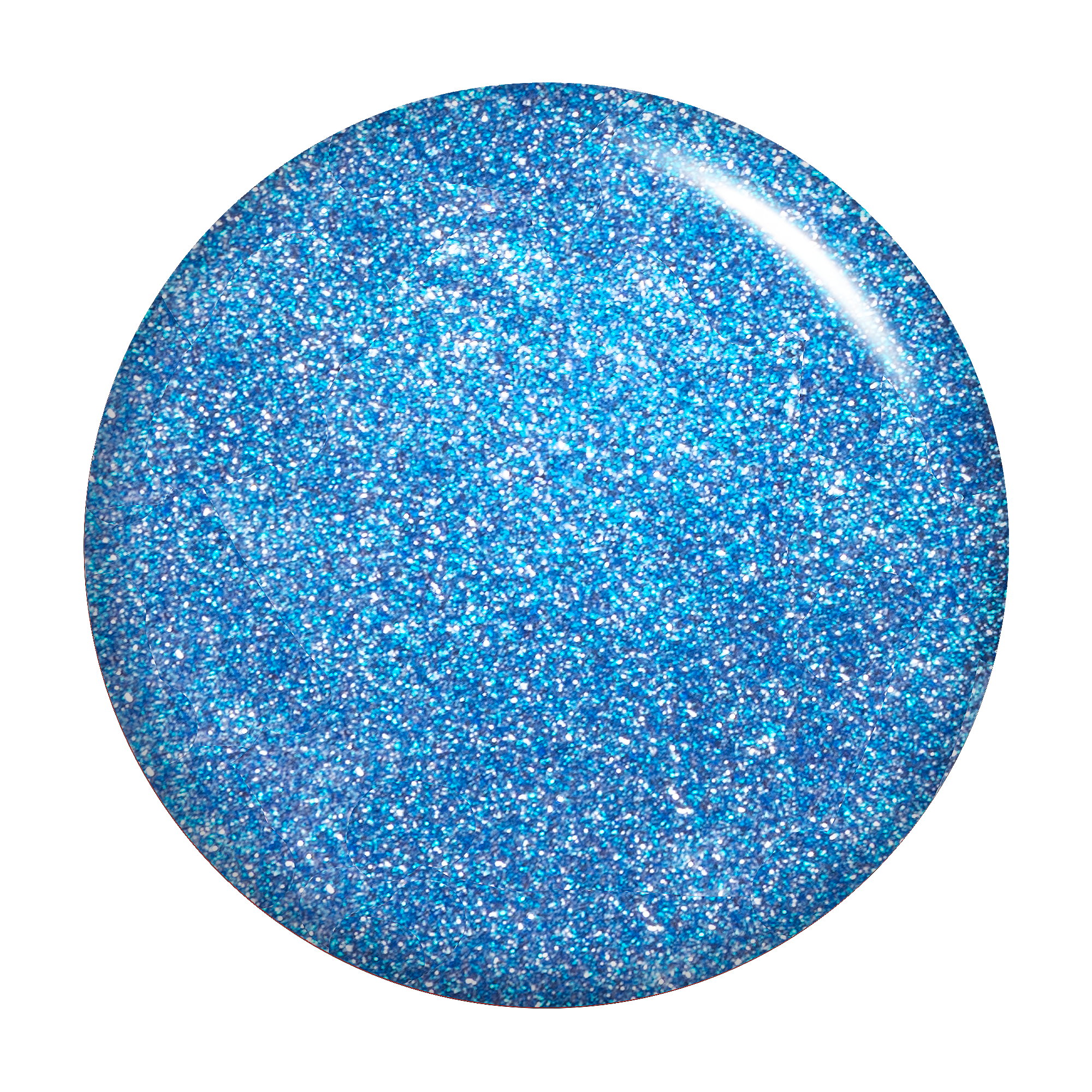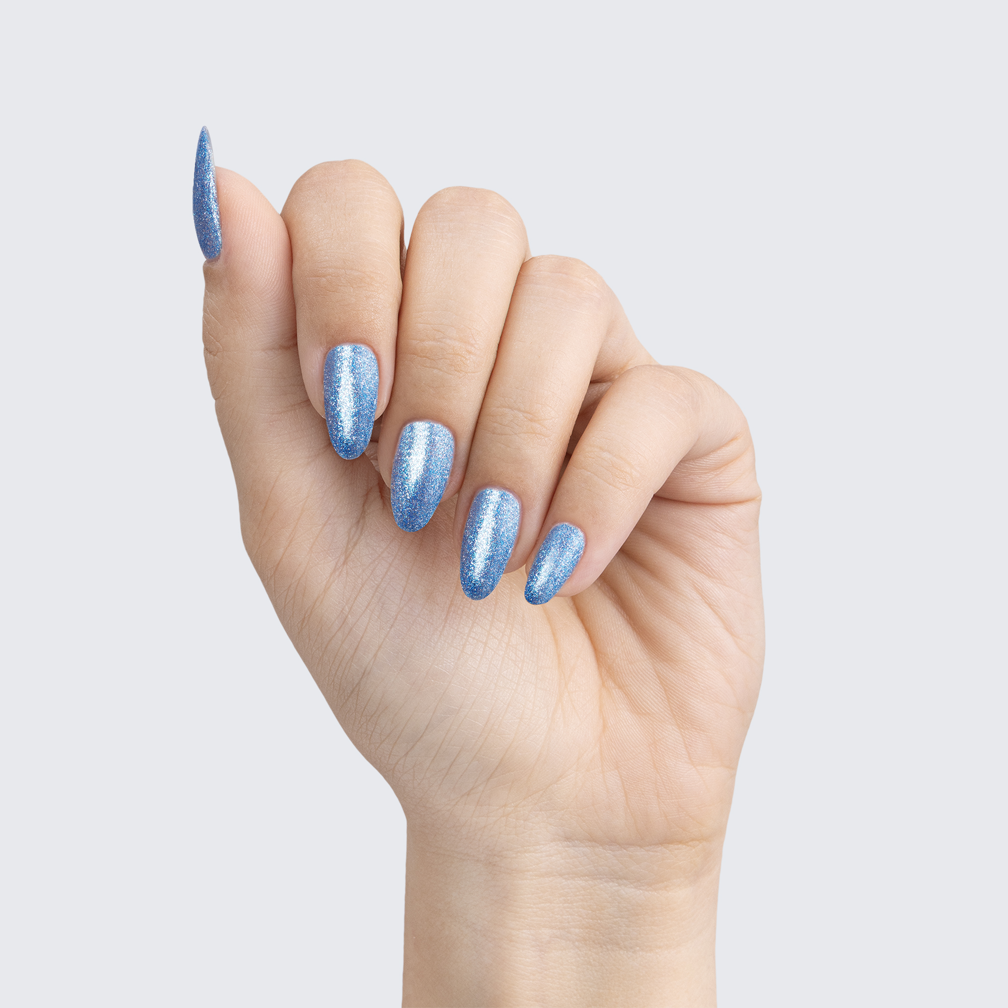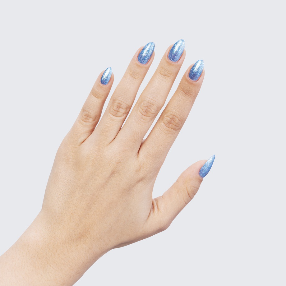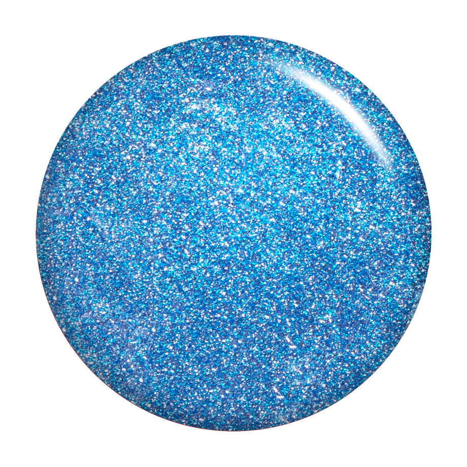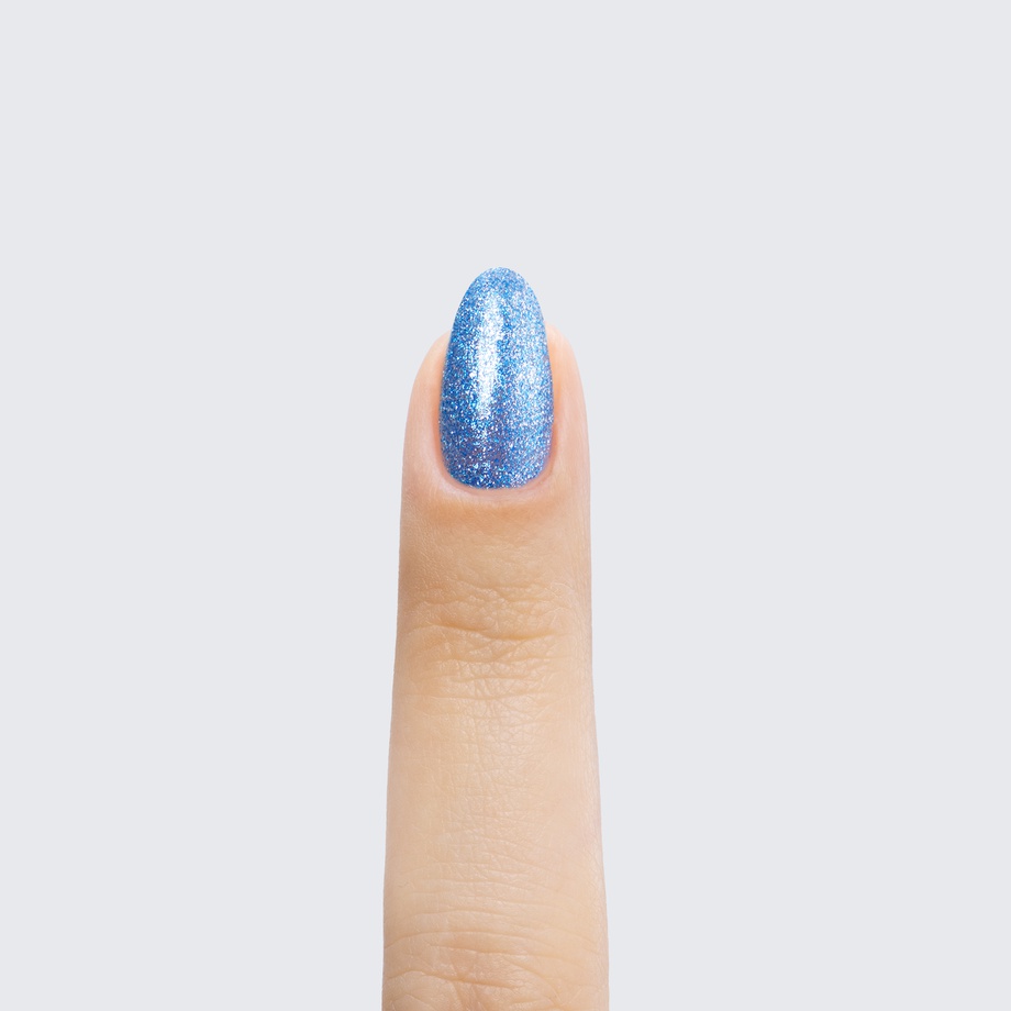 Medium blue. Metallic foil sparkle. Opaque. Cool undertone.
