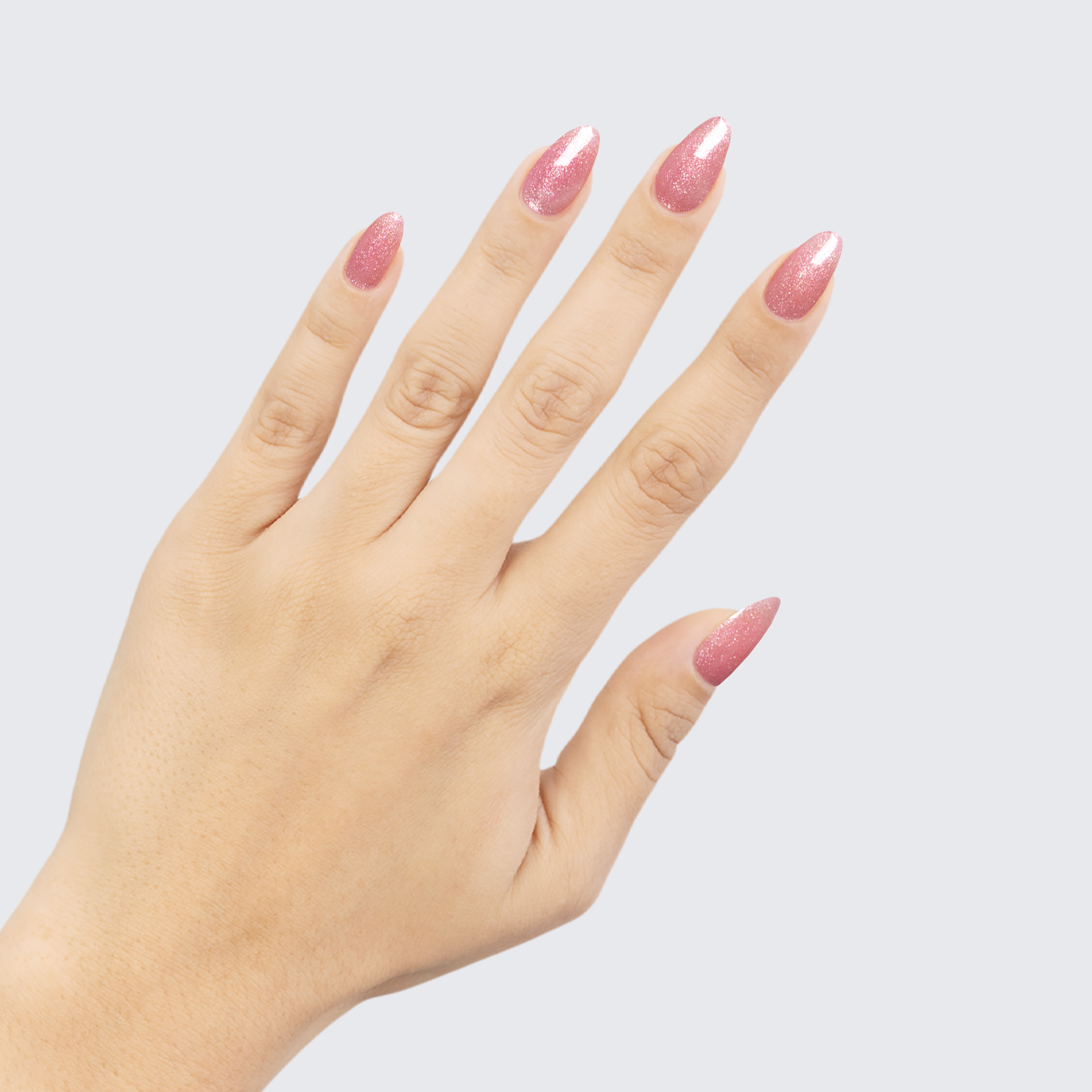 Dusty pink with faint white spots. Pink & silver shimmer. Semi transparent. Warm undertone.